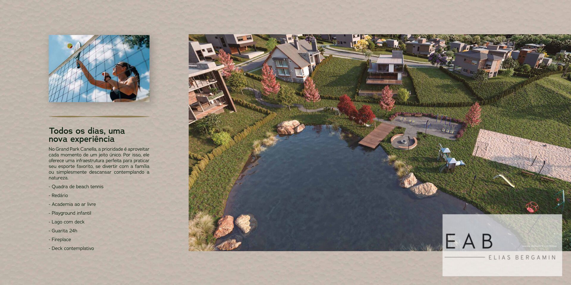 Infraestrutura de lazer a diposição dos moradores: Quadra de areia Beach tênis, Fitness ao ar livre, Playground, Deck para o Lago, Redário, Fire place.